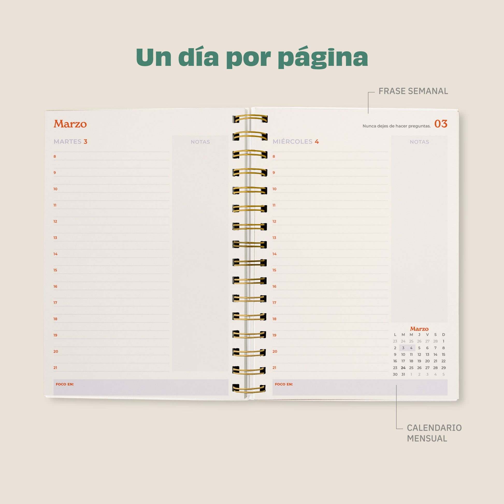 Una agenda diaria con horarios que te permite escribir, tachar y volver a escribir, para mantener organizado tu 2026.